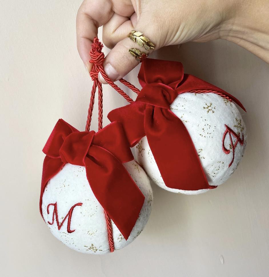 Sfera natalizia in pannolenci panna e stelline oro, personalizzata con iniziale ricamata, cordoncino e fiocco in velluto.