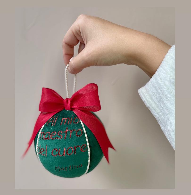 Sfera natalizia in velluto personalizzata con la scritta “Al mio maestro del cuore” e fiocco in cotone.