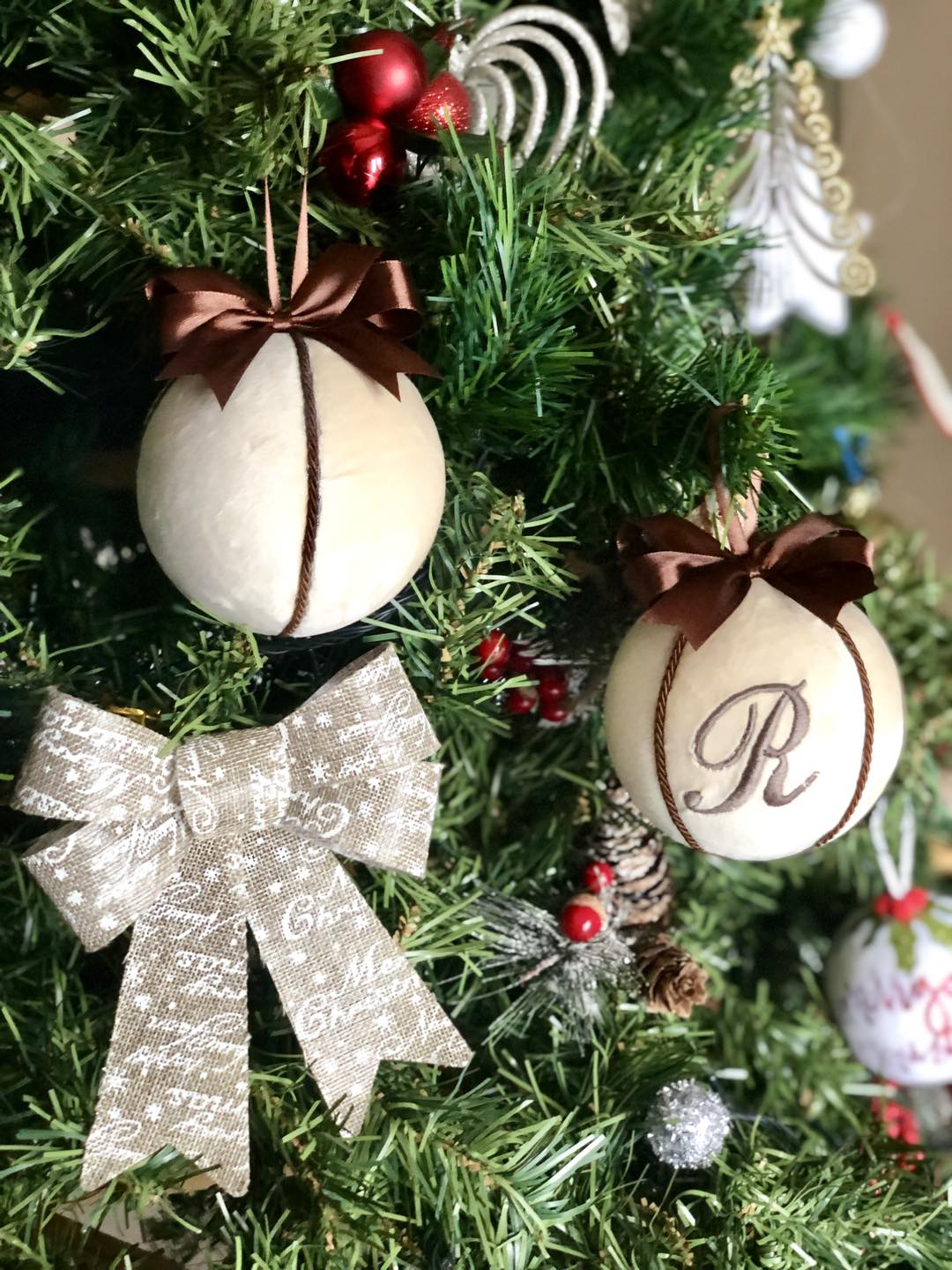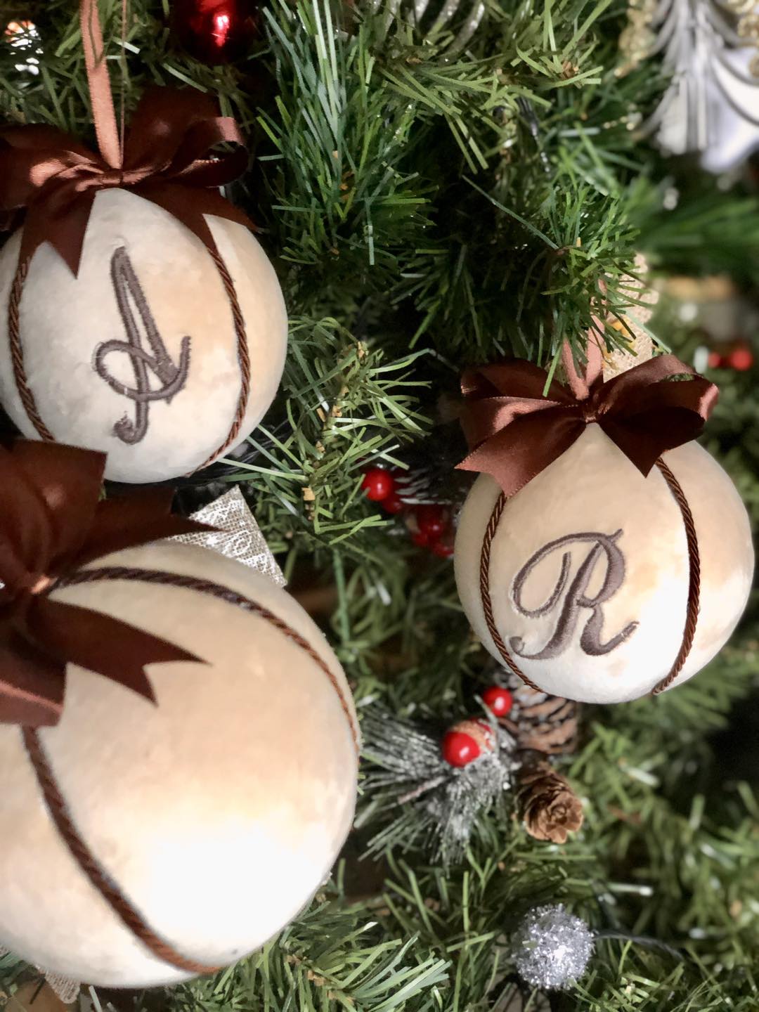 Sfera natalizia in velluto personalizzata con iniziale ricamata e fiocco in doppio raso.