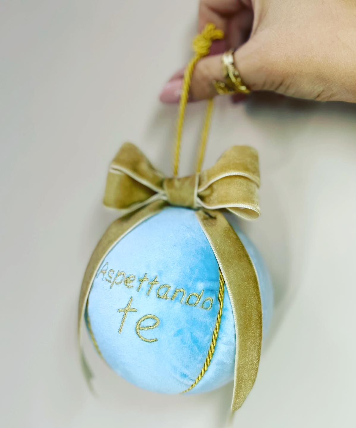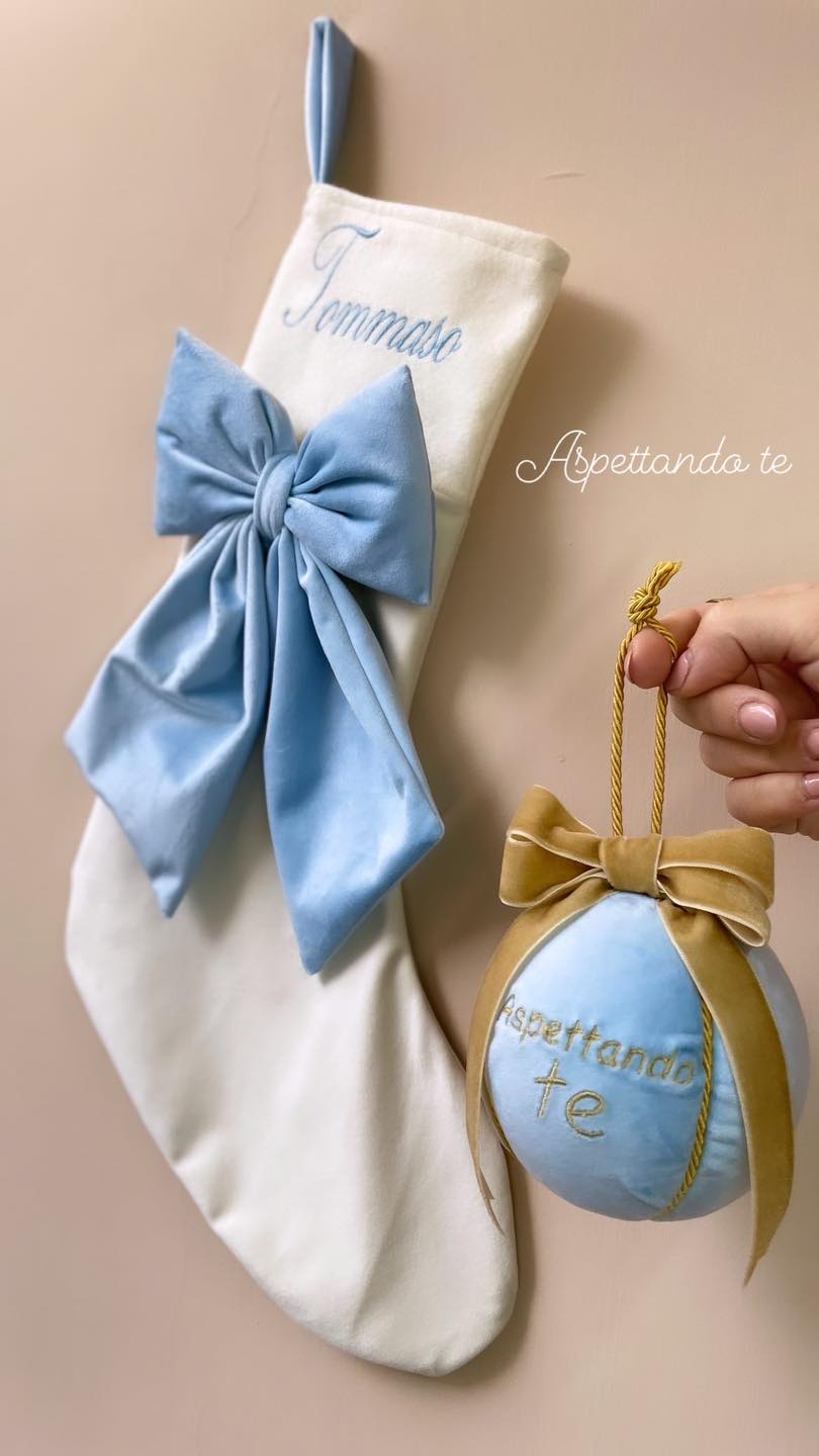 Sfera natalizia in velluto con doppio fiocco in velluto e personalizzata con la scritta “Aspettando te” ricamata.