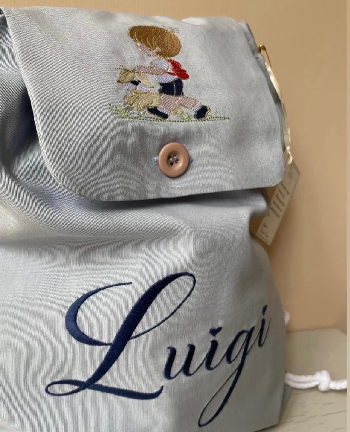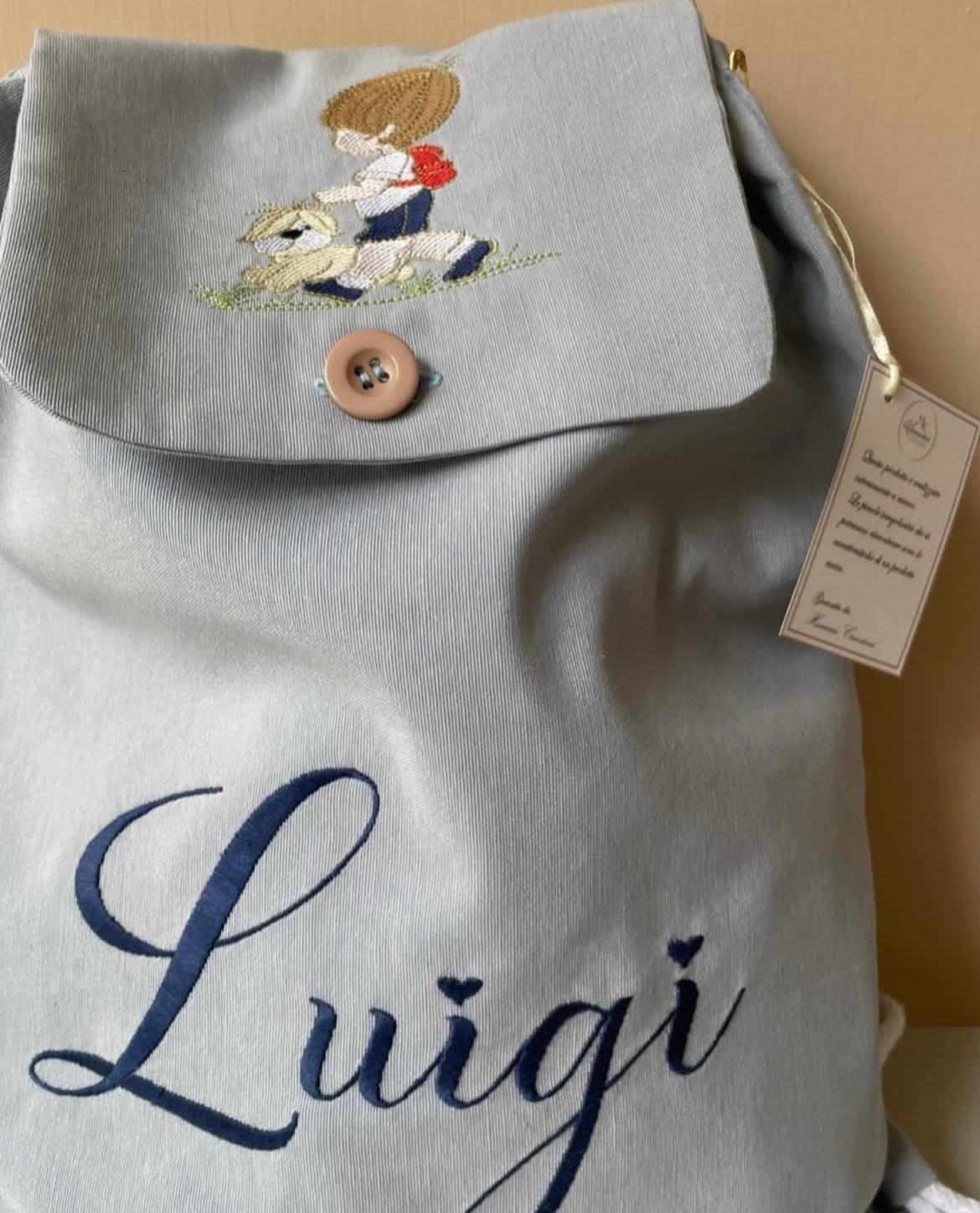 Grazioso e pratico zainetto realizzato in cotone e personalizzato con nome e bimbo ricamati a macchina. Lo zainetto presenta una doppia chiusura (internamente con cordoncino ed esternamente con bottone), che consente di riporre, in tutta sicurezza, l’occorrente del tuo bimbo/a. Inoltre, sul retro è inserita un cordoncino che consente di portarlo sulle spalle.