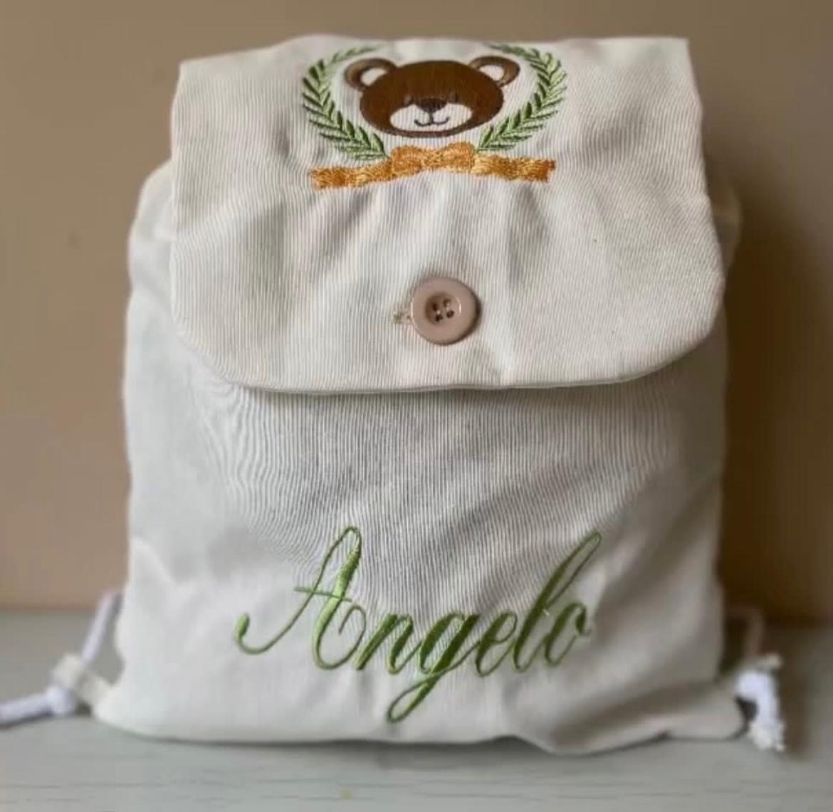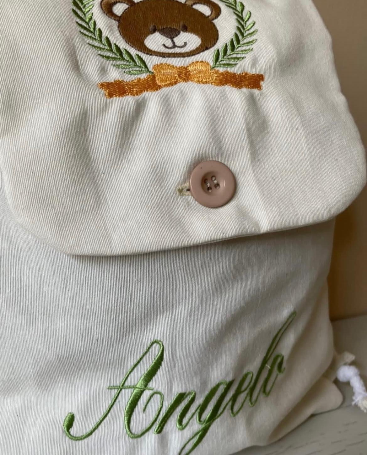 Grazioso e pratico zainetto realizzato in cotone e personalizzato con nome e orsetto ricamati a macchina. Lo zainetto presenta una doppia chiusura (internamente con cordoncino ed esternamente con bottone), che consente di riporre, in tutta sicurezza, l’occorrente del tuo bimbo/a. Inoltre, sul retro è inserita un cordoncino che consente di portarlo sulle spalle.